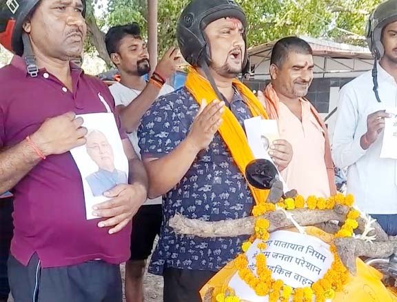 पटना। पटना में ट्रैफिक नियम को लेकर आम जनों में काफी आक्रोश है। इसे देखते हुए भाजपा कार्यकर्ताओं ने पटना के बांस घाट इलाके में ट्रैफिक नियमों का विरोध करते हुए परिवहन मंत्री शिला मंडल और नीतीश कुमार के खिलाफ जमकर नारेबाजी की। भाजपा नेताओं ने सिस्टम का अंतिम संस्कार कर विरोध भी जताया। बता दें कि पटना में एक ही वाहन का एक दिन में कई बार चालान काटा गया है। इसे लेकर लोगों में काफी आक्रोश है। प्रदर्शन में शामिल भाजपा कार्यकर्ता कल्लू का कहना है कि गरीब लोग एक ही दिन में बार बार चालान कटने से परेशान हैं। इस नियम को तत्काल वापस लेना चाहिए। पटना में फिलहाल ट्रैफिक नियमों का पालन करवाने को लेकर सख्ती बरती जा रही है। यातायात पुलिस ने एडीजी के अंगरक्षक का ही सीट बेल्ट नहीं लगाने पर 1000 रुपए का चालान काट दिया है।