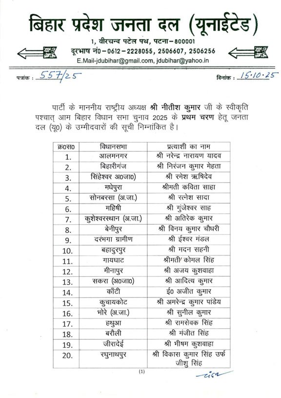 विधानसभा चुनाव में जदयू ने जारी की पहली सूची, 57 उम्मीदवारों को नीतीश ने दिया टिकट
