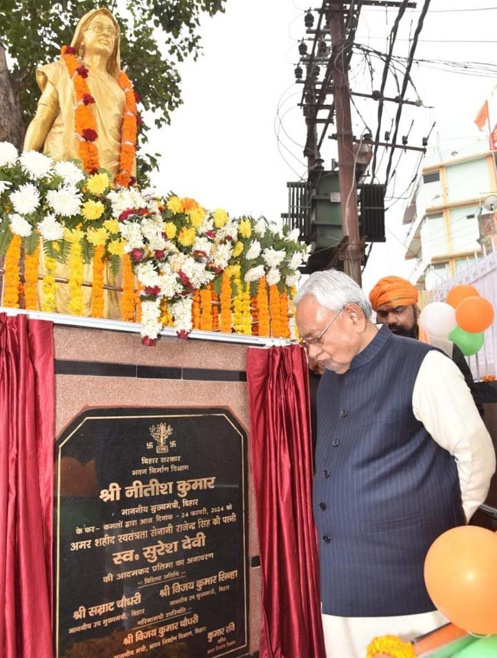 मुख्यमंत्री ने पटना में ने अमर शहीद राजेन्द्र सिंह की धर्मपत्नी की आदमकद प्रतिमा का किया अनावरण, दी श्रद्धांजलि