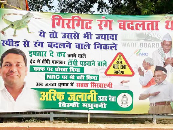 मधुबनी जिले के बिस्फी से आरजेडी नेता आरिफ जलानी की ओर से लगाए गए इस पोस्टर में नीतीश कुमार पर तीखा हमला बोला गया है। पोस्टर में लिखा गया है कि मुख्यमंत्री ने वोट लेने के लिए टोपी पहनी और मुस्लिम समाज को वक्फ बोर्ड के मसले पर धोखा दिया। साथ ही आरोप लगाया गया है कि उन्होंने इफ्तार पार्टी के जरिए मुसलमानों का समर्थन हासिल करने की कोशिश की, लेकिन असल में उनके हितों की अनदेखी की। इसमें यह भी कहा गया है कि जनता चुनाव में इसका जवाब देगी।