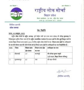 राष्ट्रीय लोक मोर्चा ने दो उम्मीदवारों का लिस्ट किया जारी, बाजपट्टी से रामेश्वर महतो और पारू से मदन चौधरी को मिला टिकट