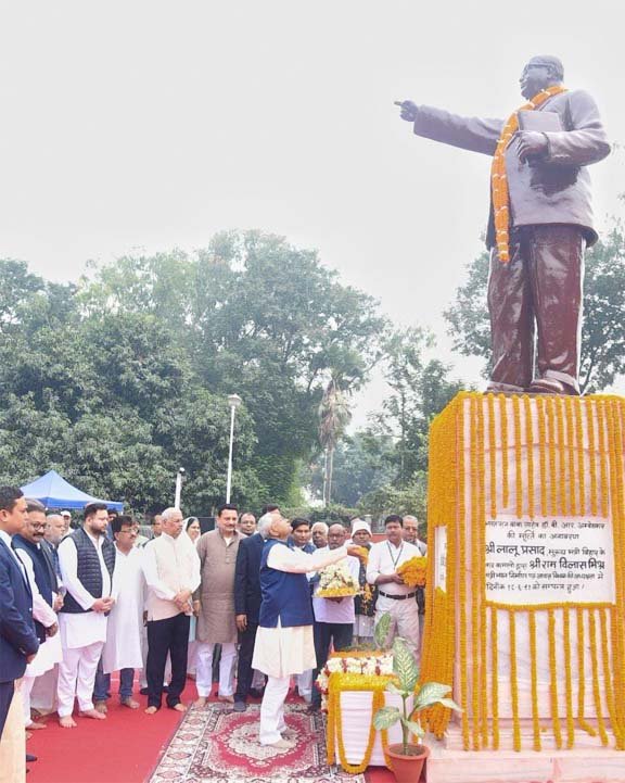 पटना। भारत रत्न बाबा साहेब डॉ. भीमराव अम्बेदकर के महापरिनिर्वाण दिवस के अवसर पर पटनाहाई कोर्ट के निकट बाबा साहेब डॉ. भीमराव अम्बेदकर प्रतिमा प्रांगण में बुधवार को राजकीय समारोह आयोजित किया गया। राज्यपाल राजेन्द्र विश्वनाथ आर्लेकर एवं मुख्यमंत्री नीतीश कुमार ने बाबा साहेब डॉ. भीमराव अम्बेदकर की आदमकद प्रतिमा पर माल्यार्पण कर उन्हें भावभीनी श्रद्धांजलि अर्पित की। इस अवसर पर उपमुख्यमंत्री तेजस्वी प्रसाद यादव, वित्त, वाणिज्य कर एवं संसदीय कार्य मंत्री विजय कुमार चौधरी, ग्रामीण विकास मंत्री श्रवण कुमार, भवन निर्माण मंत्री अशोक चौधरी, परिवहन मंत्री श्रीमती शीला कुमारी, सूचना प्रावैधिकी मंत्री मो. इसराईल मंसूरी, बिहार विधान परिषद् के उपसभापति रामचन्द्र पूर्वे, पूर्व विधान पार्षद श्रीमती रोजीना नाजिश, राज्य नागरिक परिषद् के पूर्व महासचिव अरविंद कुमार सिंह सहित अन्य सामाजिक एवं राजनीतिक कार्यकर्ताओं ने भी बाबा साहेब डॉ. भीमराव अम्बेदकर को नमन कर श्रद्धासुमन अर्पित किया। इस अवसर पर सूचना एवं जन-सम्पर्क विभाग के कलाकारों ने भजन-कीर्तन, बिहार गीत के साथ बाबा साहेब डॉ. भीमराव अम्बेदकर की जीवनी पर आधारित गीतों का गायन कर श्रद्धांजलि अर्पित की।