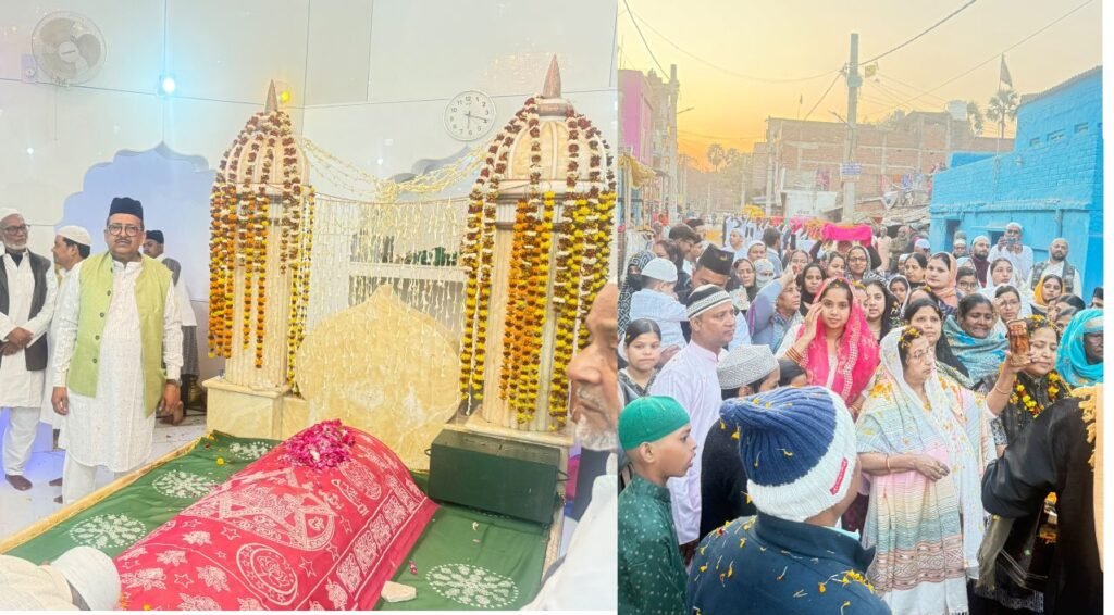 बिक्रम। हिंदू मुस्लिम एवं सर्व धर्म के एकता एवं भाईचारा के मिशाल हजरत ख्वाजा नुरुल होदा चिस्ती के मजार पर शनिवार को हजारों की संख्या में चादर पोशी की एवं अमन चैन देश दुनिया की तरक्की की दुआ किया गया.10वी उर्स मुबारक कार्यक्रम के आयोजन के मौके पर बिहार, उड़ीसा, पश्चिम बंगाल, असम, जम्मू कश्मीर, झारखंड सहित अन्य प्रदेश के कोने कोने से हजारों की संख्या में लोगों ने आकर चादरपोशी की. चादरपोशी के लिए बाबा के घर से मजार तक भव्य जुलूस निकली गई इस दौरान कव्वालों ने अपनी कव्वाली पेश की। कार्यक्रम के दौरान कमिटी के अध्यक्ष लतीफ अंसारी, सचिव इशरत अंसारी, सफीक अंसारी, महजिद अंसारी, एजाज आलम, मुस्तरी, सकील मुखिया, कलाम, हसन, शशांक शेखा मिश्रा, रवि, गुप्ता सहित कई जनप्रतिनिधियों ने शिरकत किया। मजार पर सुबह में कुरानखानी, मिलाद शरीफ एवं संध्या पहर चादरपोशी के बाद कोलकाता से आए प्रख्यात कव्वाल खास महफिल ए शाम , रोहतास से मुबारक वारसी कव्वाल, नवादा से अजहर साबरी कव्वाल एवं मुजफ़्फ़र वारसी कव्वाल ने शमा बंधा. आयोजक मंडली में पत्रकार रवीश कुमार मणि एवं मिसकिनया घराना के लोग शामिल थे। सुरक्षा व्यवस्था को लेकर स्थानीय थानाध्यक्ष बिनोद कुमार, सब इंस्पेक्टर वरुण कुमार, शुभम कुमार एवं पुलिस लाइन से आए भारी में सुरक्षा बल विधि व्यवस्था बनाए रखा.