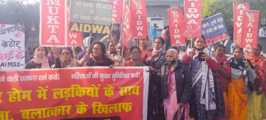 पटना। पटना के गायघाट शेल्टर होम में लड़कियों के साथ यौन हिंसा, बलात्कार, मारपीट एवं अमानवीय व्यवहार के खिलाफ महिला संगठनों की ओर से राजधानी के बुद्ध स्मृति पार्क से महिलाओं का आक्रोषपूर्ण प्रतिवाद मार्च निकाला गया। प्रतिवाद मार्च का नेतृत्व एडवा के रामपरी, नीलम देवी, सुनीता, ऐपवा की मीना तिवारी, शशि यादव, बिहार महिला समाज की निवेदिता, राजश्री किरण, एडब्ल्यूएसएफ की आसमां खान, आल इंडिया महिला सांस्कृतिक संगठन की अनामिका, महिला मौलिक अधिकार मंच के अख्तरी बेगम, सुष्मिता, महिला विकास मंच से अरूणिमा कुमारी, स्त्री मुक्ति संगठन के आकांक्षा, कोरस के समता राय आदि शामिल हुईं।