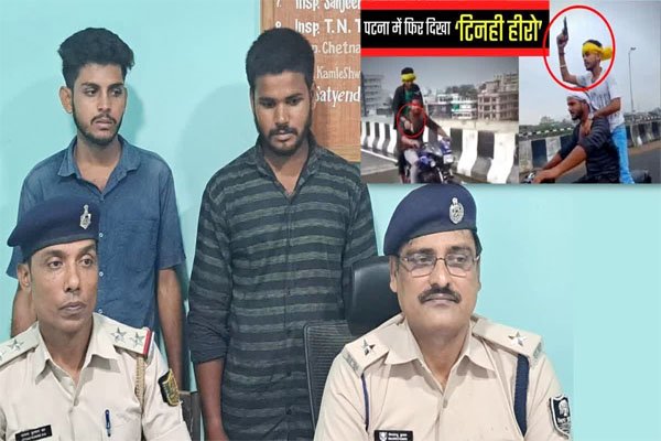 पटना। बिहार में इन दिनों युवा हथियार के साथ वीडियो बनाकर फेमस होने में लगे हैं, लेकिन उन्हें ये नहीं पता है पुलिस के सामने ऐसी हीरोगिरी नहीं चलने वाली है। ऐसी ही खबर राजधानी पटना से आ रही है। दरअसल रील बनाकर फेमस होने का इन दिनों ट्रेंड चला गया है। इसी कड़ी में पटना के मरीन ड्राइव पर हथियार लहराने का वीडियो वायरल होने के बाद पुलिस ने ऐसे ही दो टिनही हीरो को गिरफ्तार कर लिया है, जिसके पास से एक पिस्टल व बाइक बरामद की गई है। हालांकि, जो पिस्टल वीडियो में लहरा रहा है, वह सिगरेट का लाइटर निकला। बताया जा रहा है की चलती बाइक पर हथियार लहराने वाला दोनों युवक दिग्घी थाना क्षेत्र का रहने वाला है, जिसकी पहचान आकाश कुमार व मुकेश कुमार के रूप में हुई है। दोनों से पूछताछ के बाद पुलिस आगे की कार्रवाई कर रही है। वही इस कार्रवाई के बारे में पाटलिपुत्र थानाध्यक्ष विमलेंदु कुमार ने दी। बता दे की हालिया दिनों में बाइक सवार एक लड़की का पिस्तौल लहराते वीडियो वायरल हुआ था, जिसमें बुद्ध कॉलोनी थाने की पुलिस ने लड़की को जेल भेजा था। हंटर क्वीन के नाम से इंस्टाग्राम चलने वाली लड़की का भी बाइक से स्टंट करने व हथियार लहराने का वीडियो वायरल हुआ था। पुलिस ने 37000 रुपए का चालान काट गाड़ी का रजिस्ट्रेशन रद्द कर दिया था।